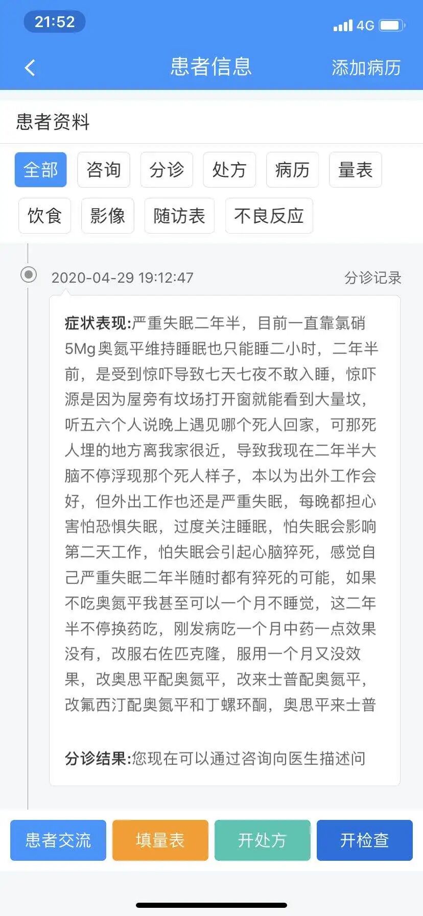 后期患者离家外出打工,这种睡眠状态仍未改善,我们可以看做是患者由于惊吓出现了急性失眠,后来又因为睡眠卫生问题导致失眠慢性化。患者自己也注意到这个问题,称自己恐惧失眠,担心睡眠,怕失眠影响第二天的工作。